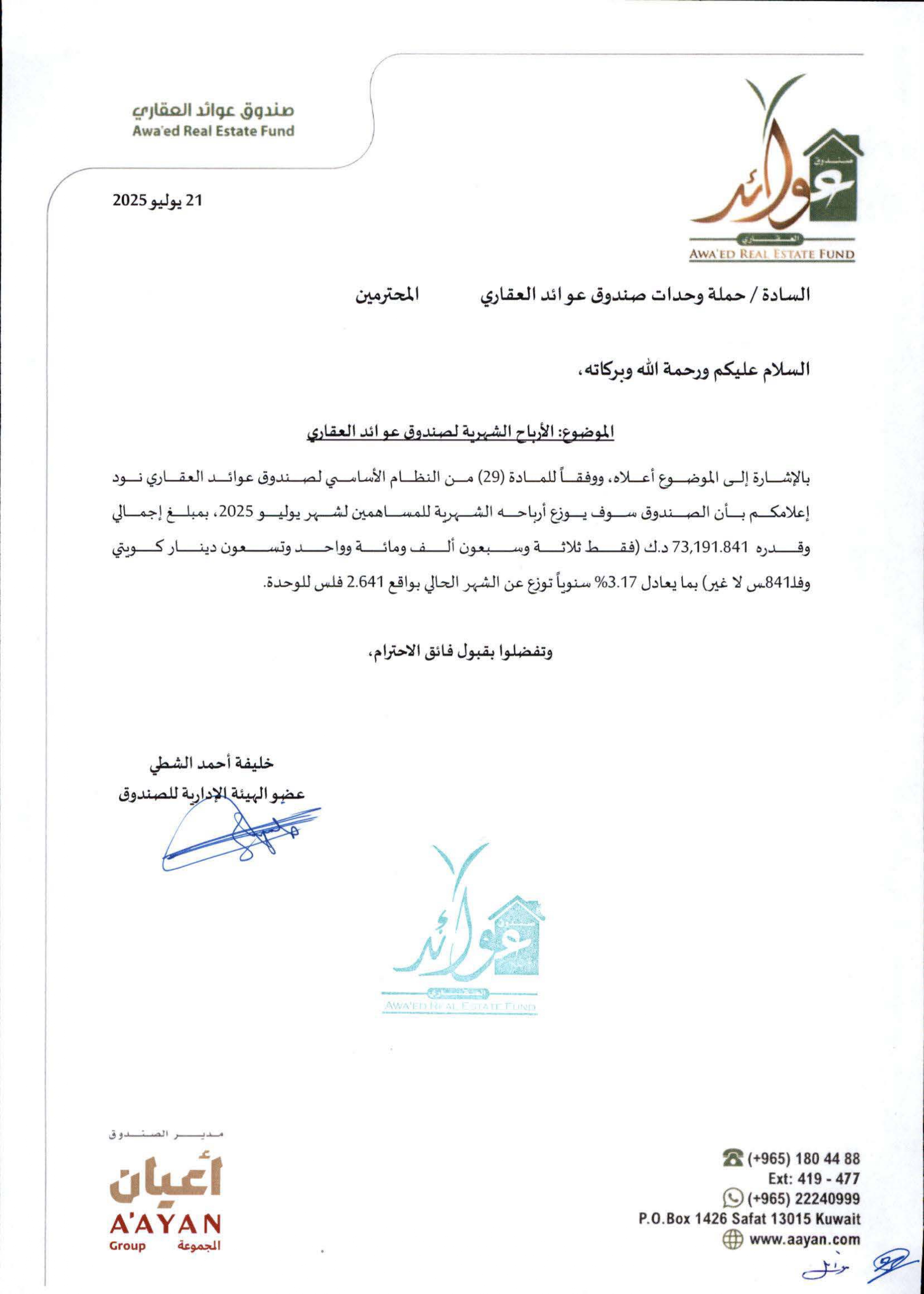 The Monthly Profits - Awaed Real Estate Fund - July 2025