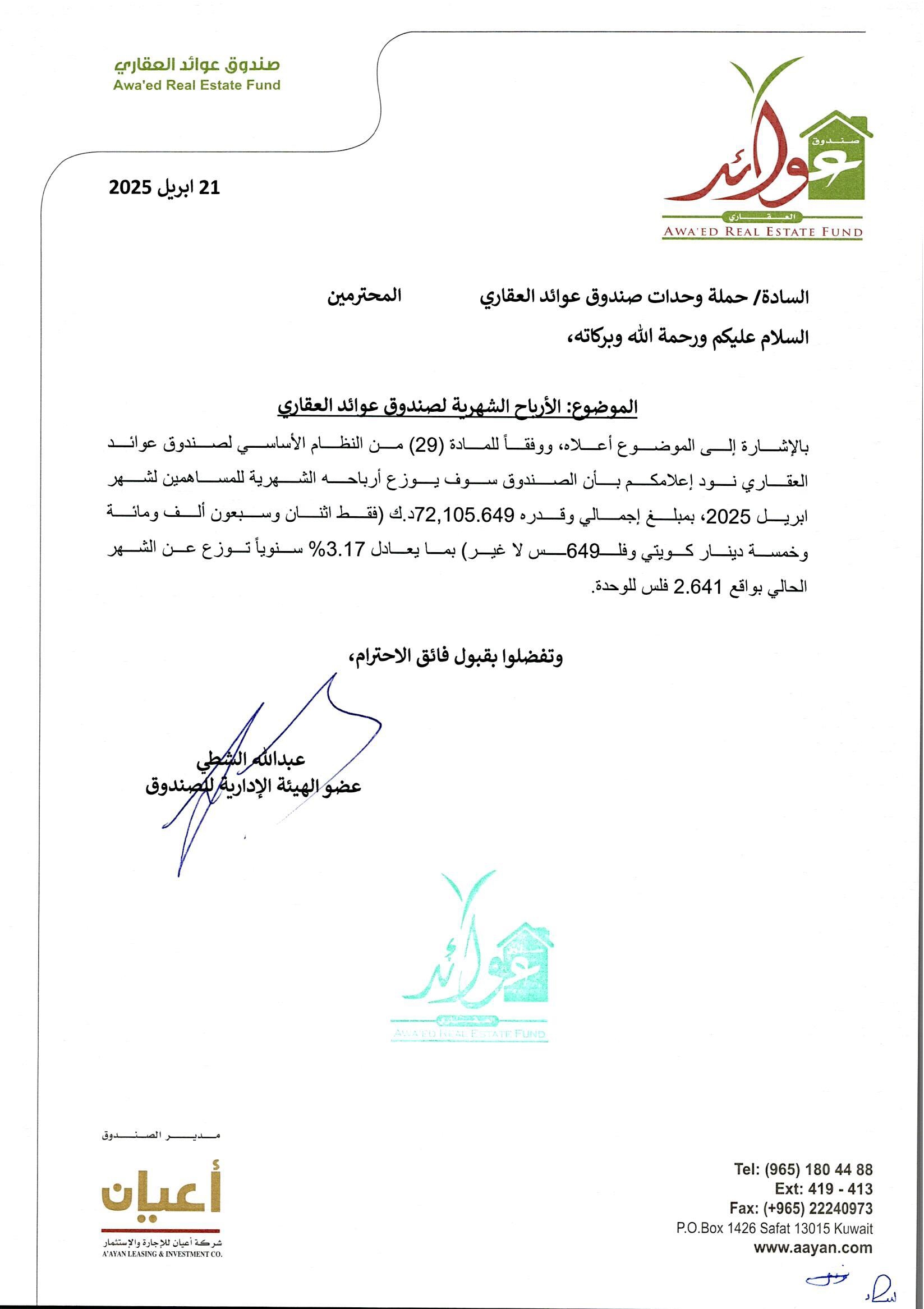 The Monthly Profits - Awaed Real Estate Fund - April 2025