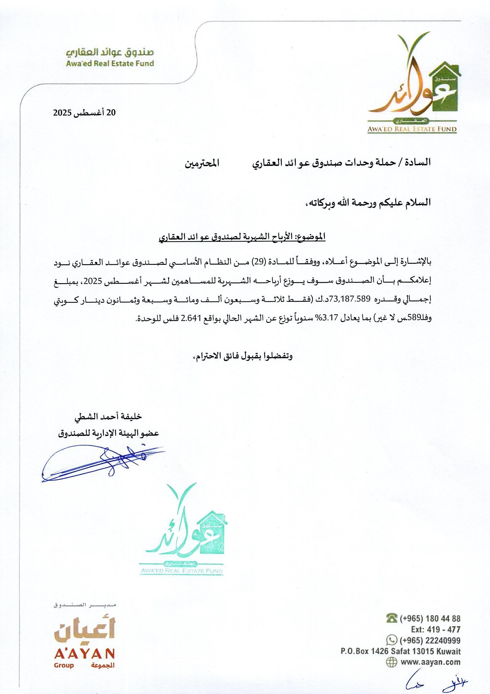 The Monthly Profits - Awaed Real Estate Fund - August 2025