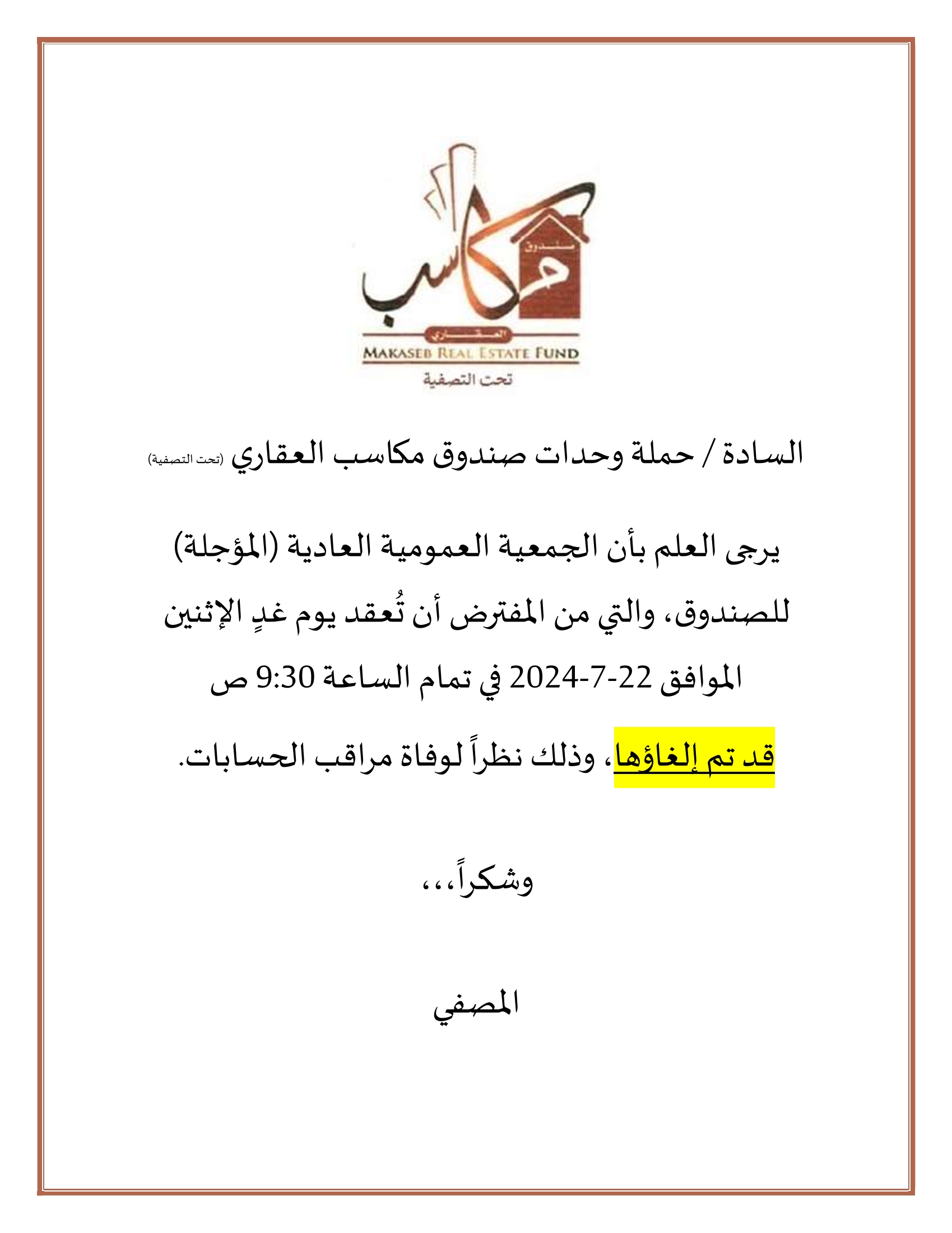 إخطار - إلغاء انعقاد جمعية حملة وحدات صندوق مكاسب العقاري_تحت التصفية_للسنة المالية المنتهية في 31-12-2023 (إضغط هنا)