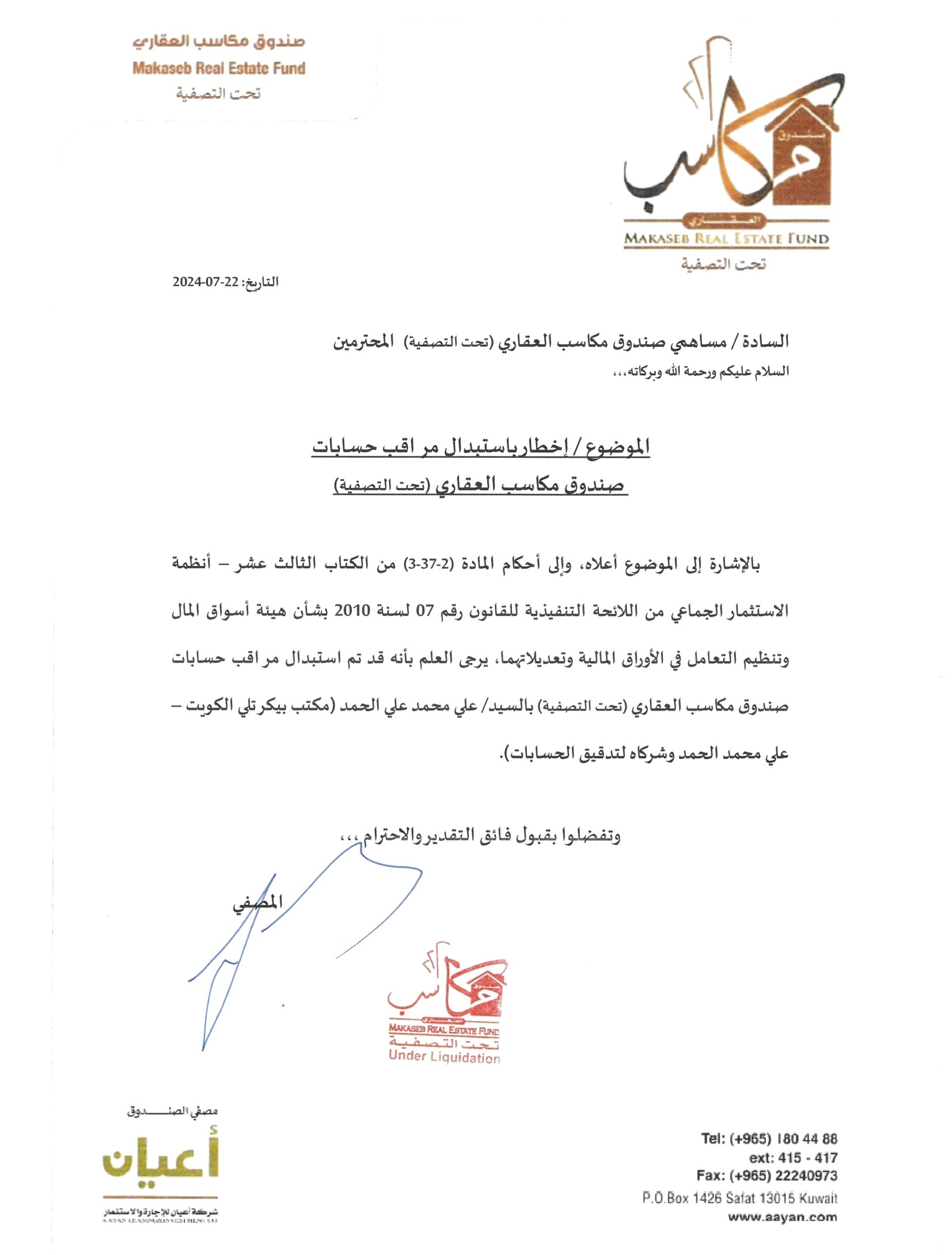 إخطار بشأن استبدال مراقب حسابات صندوق مكاسب العقاري_تحت التصفية (إضغط هنا)